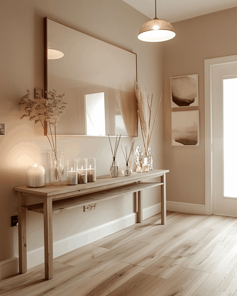 Setz auf feine Düfte, um deinem Flur mehr Stimmung zu geben. Duftkerzen aus Sojawachs riechen angenehm und sehen edel aus. Diffusoren mit natürlichen Ölen halten den Duft konstant im Raum. Wähle frische Noten wie Zitrus oder Eukalyptus, um den Flur lebendig wirken zu lassen. Ein klarer, angenehmer Geruch schafft sofort einen guten ersten Eindruck.