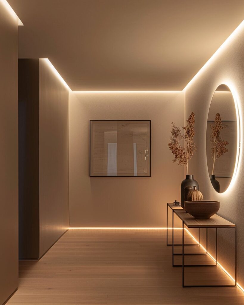 Setze auf sanftes Licht von Wänden oder Decke, statt grelle Deckenstrahler zu nutzen. LED-Strips hinter Spiegeln oder Möbeln lassen den Flur größer wirken und schaffen Wärme. Wandleuchten mit Milchglas geben gleichmäßiges Licht ohne harte Schatten. Kombiniere verschiedene Lichtquellen, um Tiefe und Struktur zu erzeugen. So fühlt sich der Flur einladend und ruhig an.