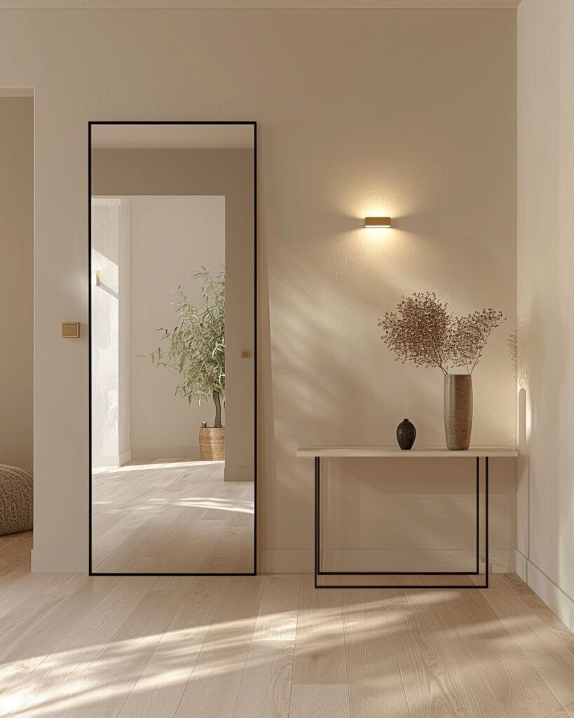 Häng einen großen Wandspiegel an die Stirnseite deines Flurs. Ein Spiegel reflektiert Licht und lässt schmale Flächen sofort größer wirken. Kombinier ihn mit einer neutralen Wandfarbe und klaren Linien im Möbel. So schaffst du optische Tiefe und mehr Weite im Durchgangsbereich.