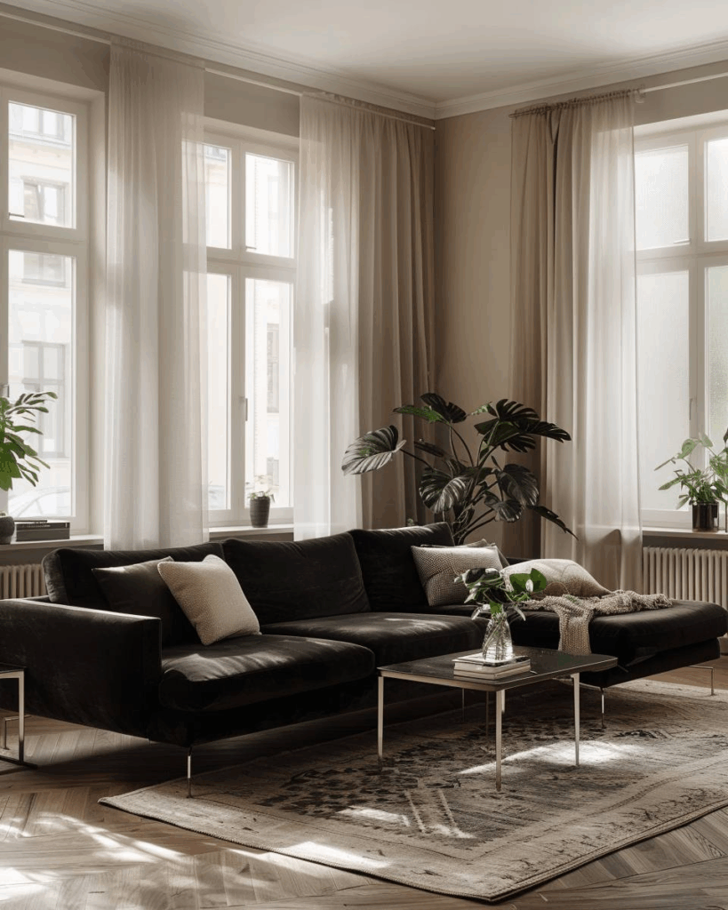 Ein dunkles Sofa ist ein Statement im Wohnzimmer und wirkt schnell schwer oder massiv, wenn du den Raum nicht bewusst gestaltest und einrichtest.