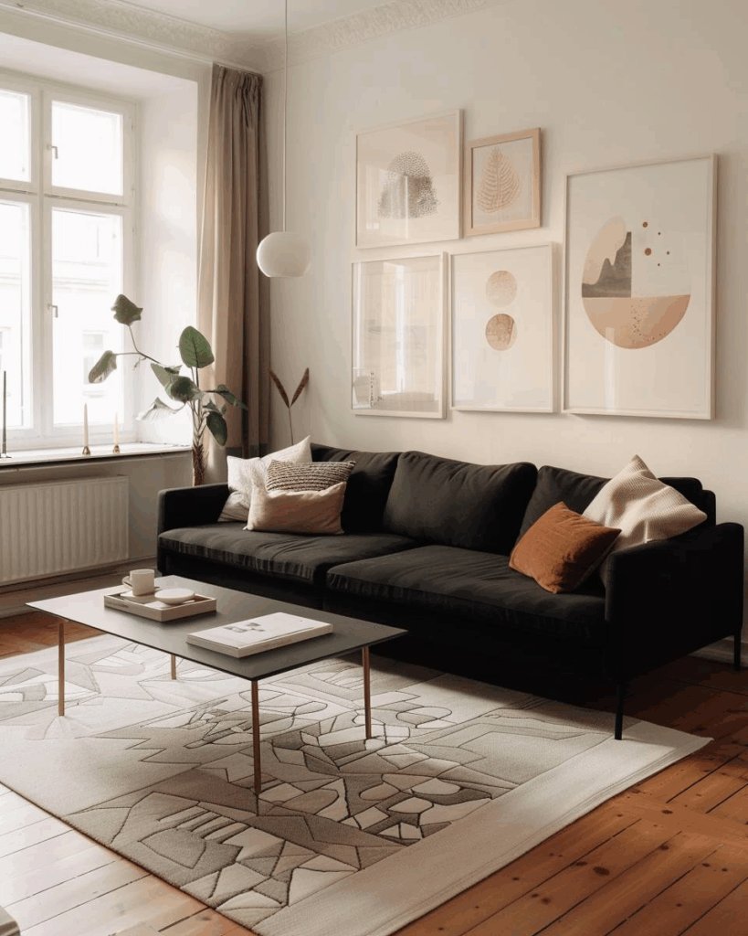 Zeige Kunstwerke in hellen Farben über dem dunklen Sofa. Lichtes Beige, Weiß oder Pastelltöne schaffen Kontrast und Leichtigkeit. Dein Wohnzimmer wirkt durch helle Bilder sofort frischer und weniger drückend. Platziere die Bilder mittig über dem Sofa für ein stimmiges Gesamtbild.