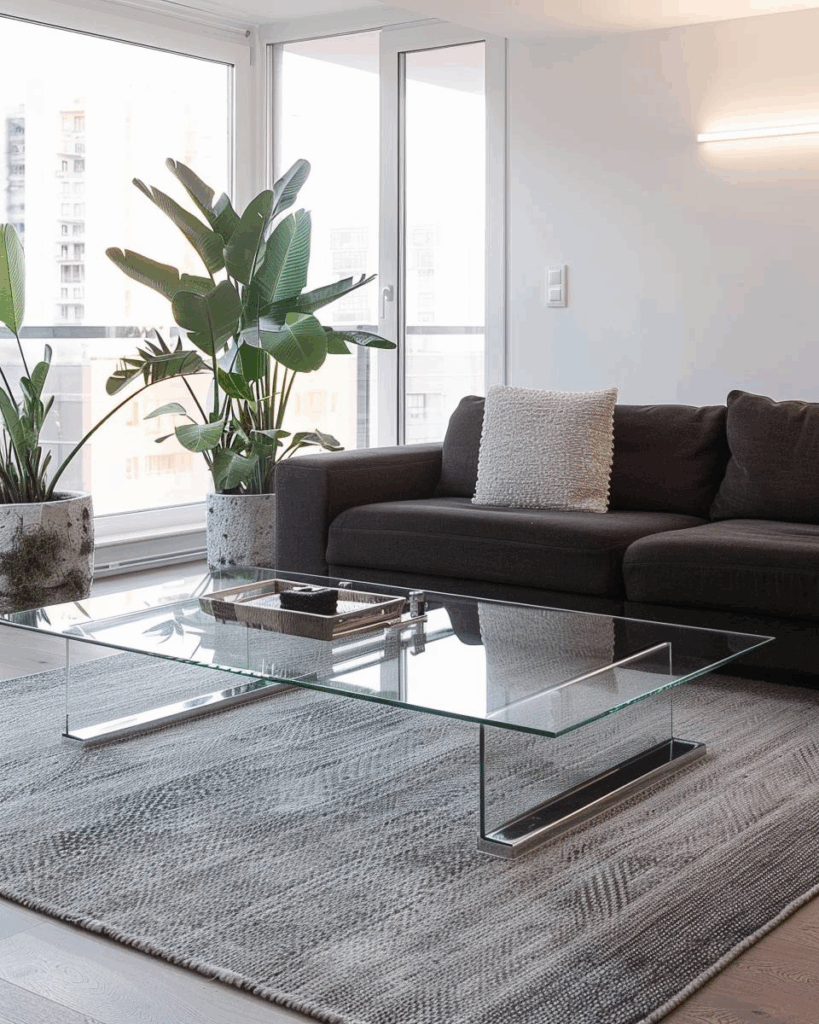 Setze statt Couchtisch einen Glas-Tisch ein. Glas bringt Leichtigkeit und lässt das Wohnzimmer mit dunklem Sofa heller und größer wirken. Glas reflektiert Licht und schafft so einen frischen Kontrast zum dunklen Polster. Wir reinigen Glas schnell und pflegen es leicht. So bekommst du mehr Luftigkeit und Stil in deinen Raum.
