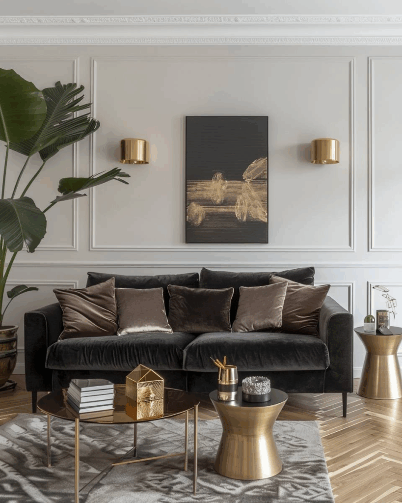 Setze auf Metall-Deko für einen frischen Look. Messing-Lampen bringen Glanz zum dunklen Sofa. Silberne Beistelltische wirken klar und modern. Goldene Vasen setzen starke Akzente am Sofa. Halte das Farbschema schlicht, damit die Metallic-Elemente wirken.