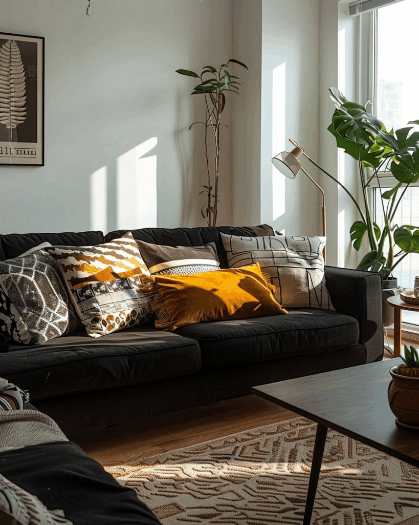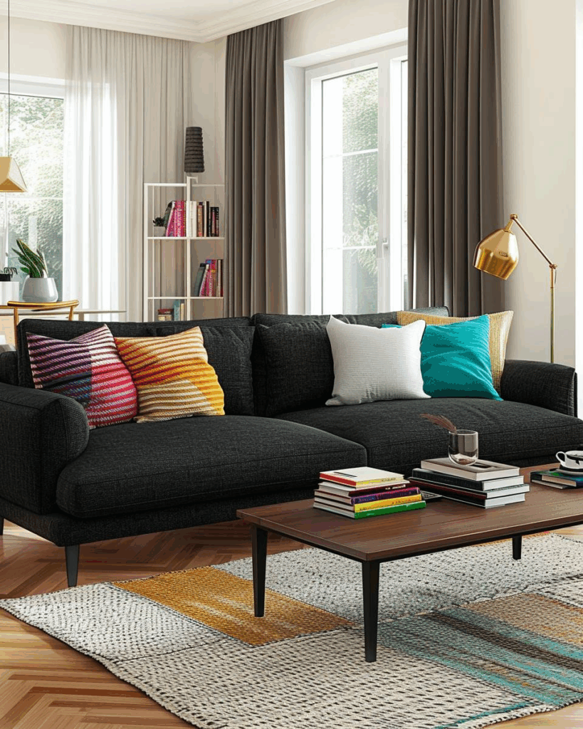 Setze helle Kissen für starken Kontrast, kombiniere goldene Akzente und ergänze das Sofa mit einem farbenfrohen Teppich darunter, um mehr Leichtigkeit und einladende Atmosphäre zu schaffen.