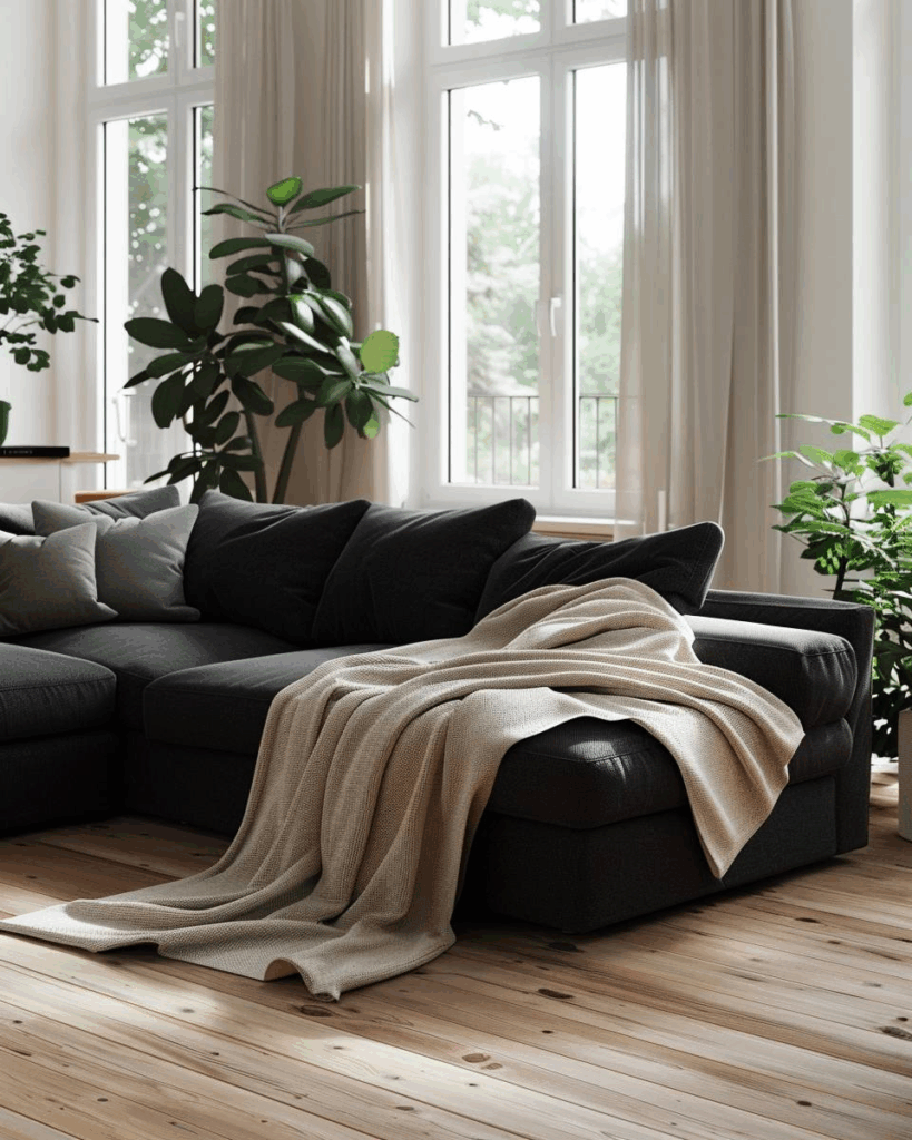 Wähle leichte Stoffe wie Baumwolldecken, Leinenkissen oder Samtvorhänge. Diese Materialien fühlen sich angenehm an und bringen einen weichen Look ins Wohnzimmer. So wirkt dein dunkles Sofa sofort gemütlich und warm. Farben wie Creme, Hellgrau oder Blush passen gut dazu. Kombiniere mehrere Texturen für mehr Spannung im Raum.
