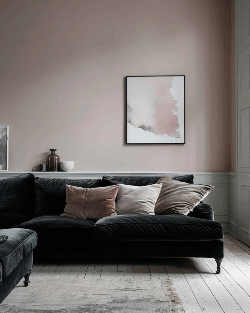 Wände in sanften Pastellfarben lassen ein dunkles Sofa weich wirken. Helle Farben wie Rosé, Mint oder Hellblau bringen Ruhe ins Wohnzimmer. Pastelltöne bilden einen klaren Kontrast zum Sofa und machen das Zimmer einladend. Du schaffst mit ihnen einen freundlichen und modernen Look.