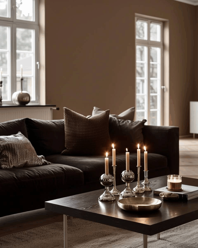 Setze Kerzenständer aus Silber oder Messing zu deinem dunklem Sofa. Sie schaffen helle Akzente und Glanz. Die edlen Töne wirken ruhig und elegant. Platziere sie auf einem Couchtisch oder Regal in Sofanähe. So lockerst du die Gesamtoptik gezielt auf.
