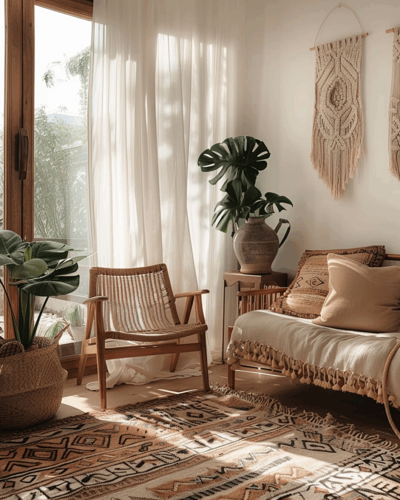 Nutze Holz, Rattan, Jute und Leinen, um dem Raum mehr Wärme zu geben. Ein Boho-Teppich wirkt am besten, wenn du ihn mit massiven Holzmöbeln und geflochtenen Körben kombinierst. Leinenkissen und Jute-Lampen schaffen Struktur und Gemütlichkeit. Achte auf natürliche Farben und vermeide Kunststoff. So entsteht ein ruhiger und authentischer Look.
