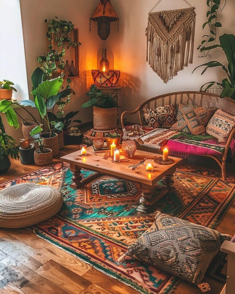 Stell Kerzen auf, um das warme Licht mit dem natürlichen Look des Boho-Teppichs zu verbinden. Wähle Kerzen in Erdtönen oder mit zarten Mustern, die zu Makramee und Rattan passen. Platziere sie auf Holztellern oder in Gläsern neben Kissen und Decken. So entsteht ein ruhiger, stimmiger Raum.