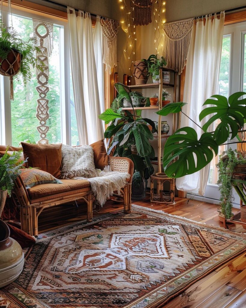 Setze Pflanzen gezielt als frische Farbtupfer zwischen deinen Boho-Teppichen ein. Große Monstera oder Palmen wirken neben bunten Teppichen besonders lebendig. Hänge kleine Makramee-Ampeln mit Efeu oder Sukkulenten an die Wand. Wähle naturfarbene Töpfe, damit Farben und Muster vom Teppich im Vordergrund stehen. So entsteht ein harmonischer Mix aus Textil und Grün.
