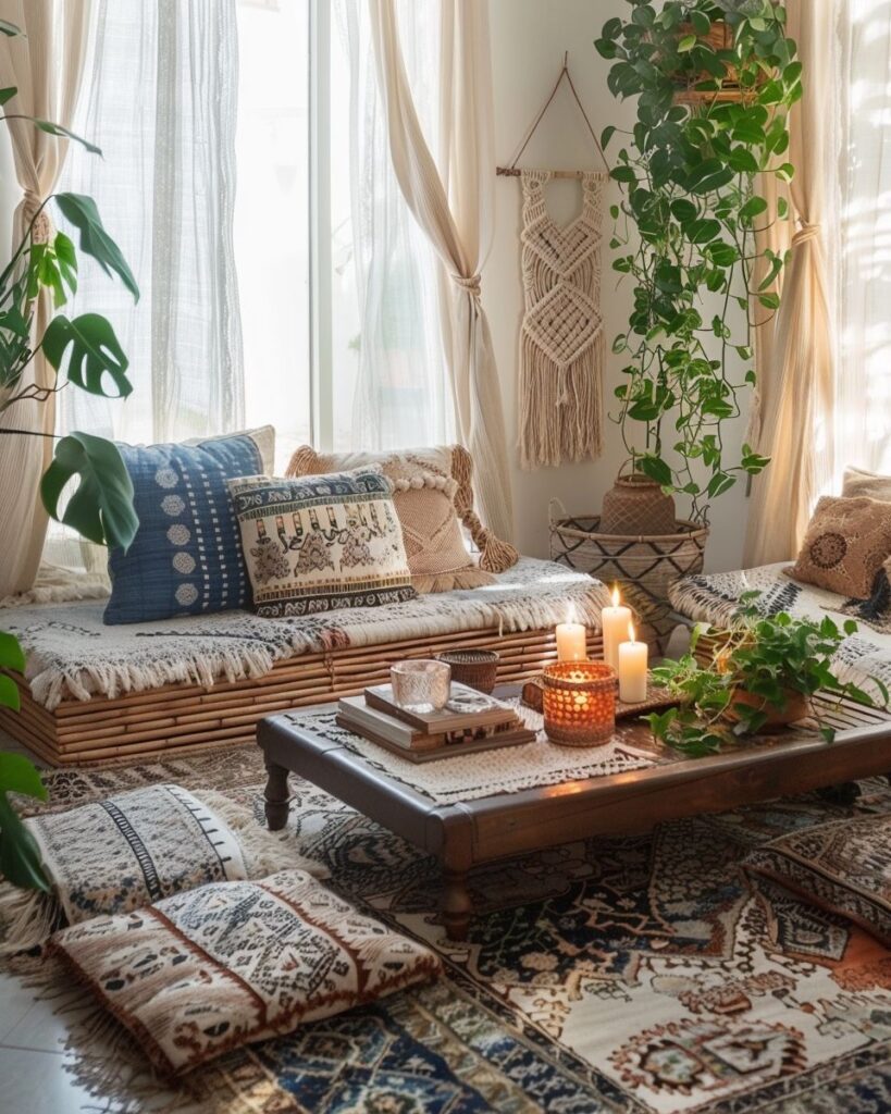 Setze auf unterschiedliche Materialien, damit dein Raum lebendig wirkt. Kombiniere den weichen Boho-Teppich mit groben Holzmöbeln, gewebten Körben und Leinenstoffen. So entsteht ein spannender Kontrast zwischen weich, rau und glatt. Achte darauf, dass sich die Farben ergänzen, damit alles stimmig wirkt.