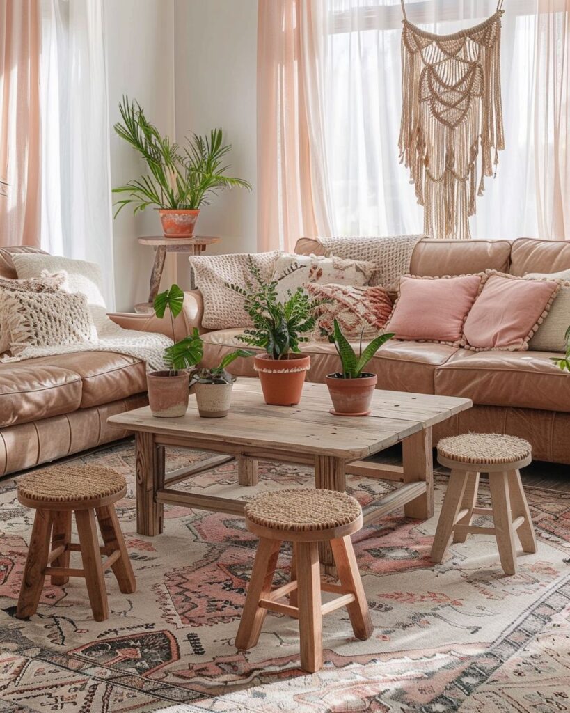 Stell einen Hocker als flexible Sitzgelegenheit neben deinen Boho-Teppich. Er passt perfekt in gemütliche Leseecken, lässt sich leicht verschieben und braucht kaum Platz. Wähle Modelle aus Holz, Rattan oder Leder, die gut zum Look des Teppichs passen. So bleibt der Stil locker, natürlich und praktisch zugleich.