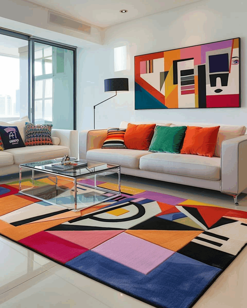 Mit geometrischen Teppichen in Primärfarben bringst du klare Linien und starke Farben in dein Zimmer. Ein Teppich mit blauen, roten oder gelben Mustern zieht sofort den Blick an. Wir legen ihn locker in die Mitte des Raumes oder unter den Couchtisch. Die starken Farben geben jedem Möbelstück mehr Tiefe.
