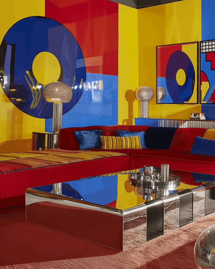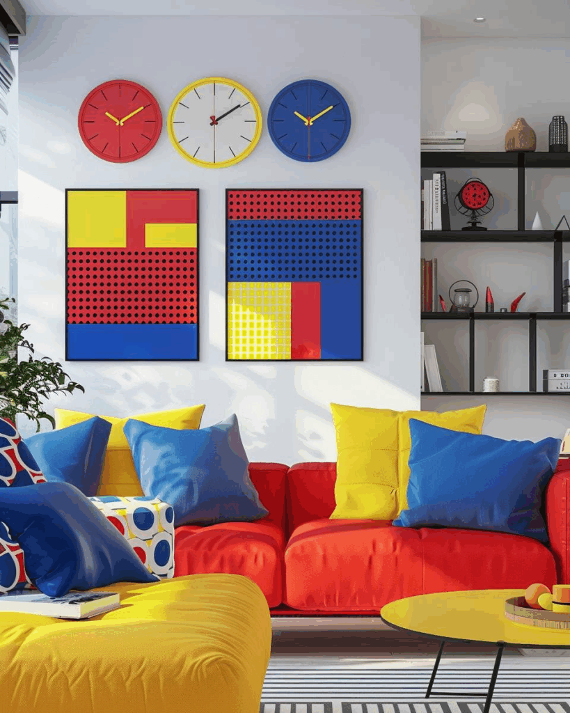 Setze auf starke Gegensätze: Knallige Farben wie Rot, Blau und Gelb sind typisch für Pop-Art. Wir wählen einfarbige Möbelstücke und mixen sie mit bunten Wänden oder Accessoires. Wir nutzen grafische Muster, um Flächen lebendig zu machen. Schwarz-weiße Details geben deinem Raum einen coolen Rahmen.