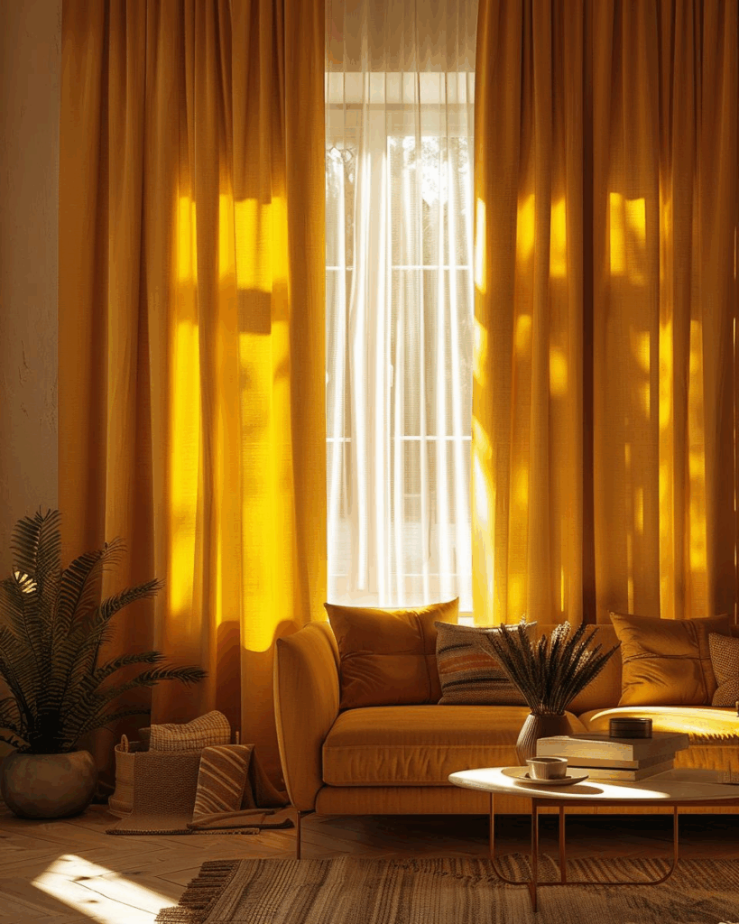 Greif zu senfgelben Vorhängen, um deinem Raum sofort wärmere Akzente zu geben. Der kräftige Gelbton bringt natürliches Licht zum Leuchten und passt gut zu neutralen Wänden wie Weiß oder Grau. Wir setzen sie gern in Wohnzimmern oder Schlafräumen ein, weil sie Gemütlichkeit ausstrahlen. Kombinier sie mit Holzmöbeln oder Textilien in Erdtönen, um den Look abzurunden.