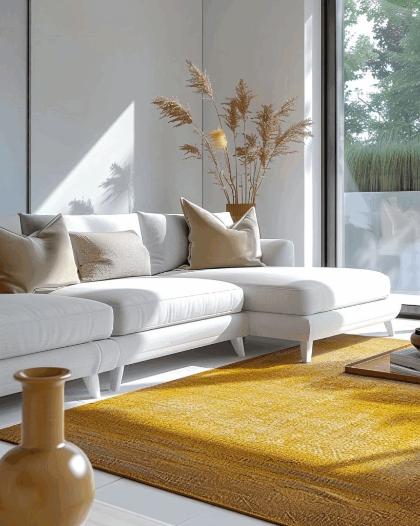 Setze senfgelbe Teppiche gezielt ein, um schlichte Räume schnell zu verändern. Teppiche in Senfgelb bringen Wärme auf kalte Böden und lockern neutrale Möbel wie weiße Sofas auf. Achte auf klare Muster, damit der Teppich modern wirkt. In kleinen Räumen reicht ein kleiner Teppich als Farbelement. Kombiniere ihn mit naturfarbenem Holz oder weißen Wänden, um das Gelb strahlen zu lassen.