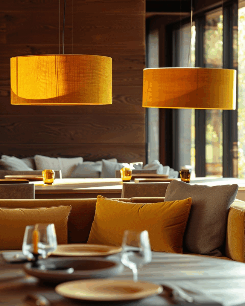 Tausche alte Lampenschirme gegen senfgelbe Stoffschirme aus. Der warme Farbton gibt Wohnzimmern, Schlafzimmern oder Fluren sofort mehr Tiefe. Senfgelb passt gut zu Holzmöbeln, Messing und schwarzen Metallgestellen. Wähle klare Formen wie zylindrisch oder konisch, um den Look ruhig zu halten. Achte auf dimmbare Leuchtmittel, damit das Licht weich bleibt.