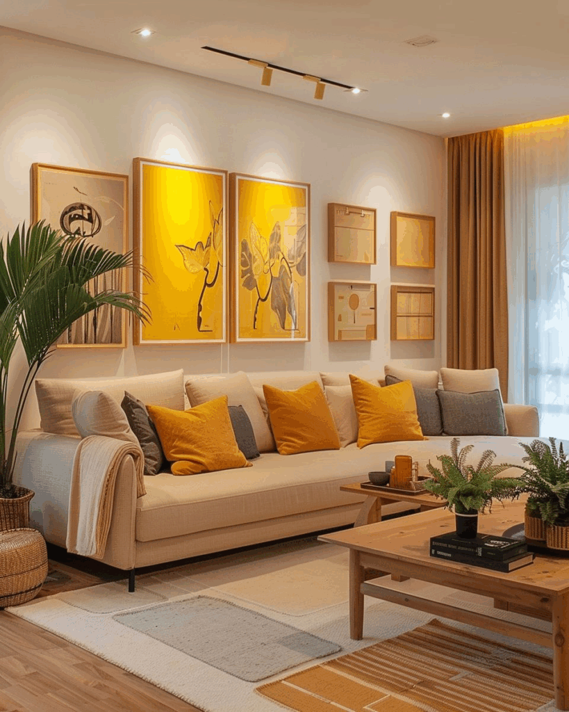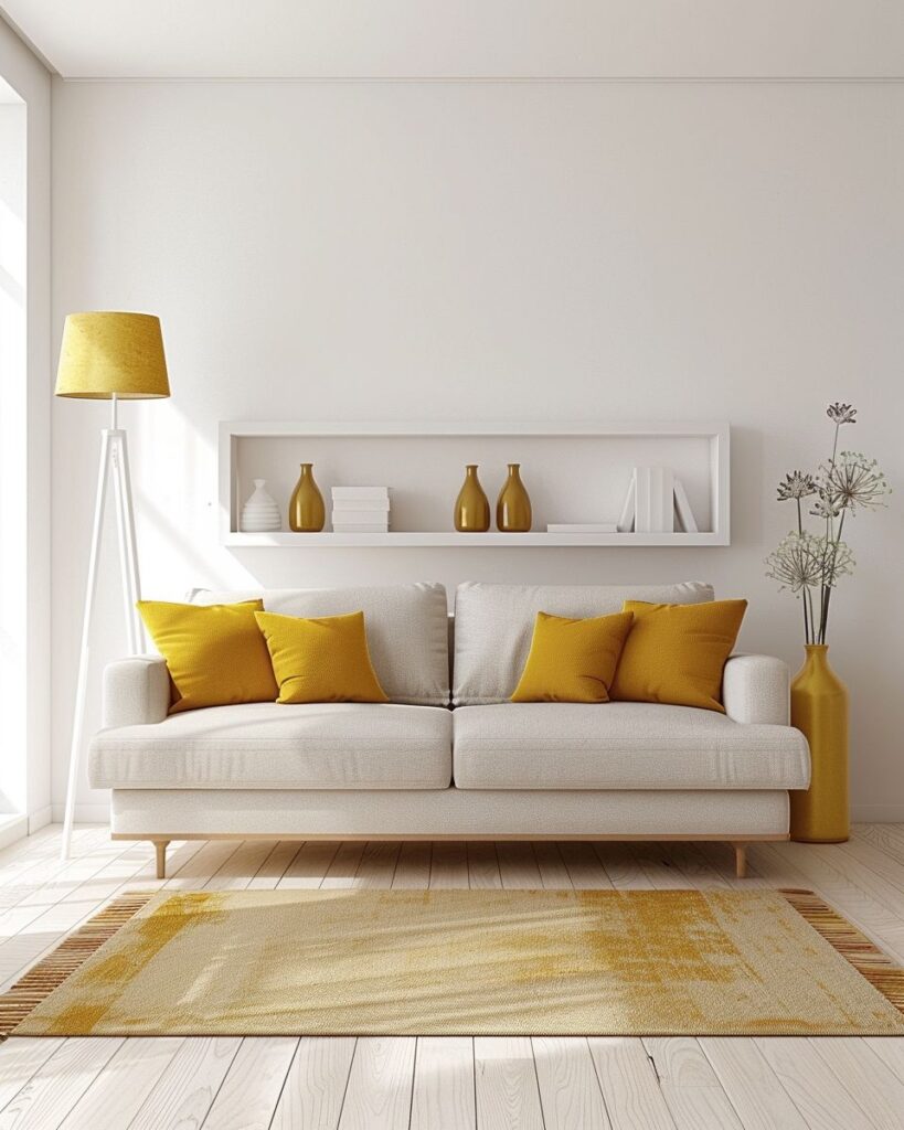 Integriere senfgelbe Kissen ins Sofa-Ensemble
