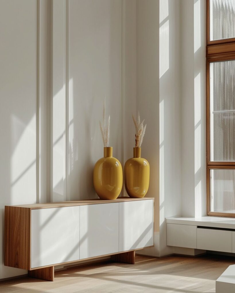 Stell senfgelbe Vasen auf dein Sideboard, um ruhige Flächen aufzubrechen. Die warme Farbe schafft sofort Kontrast zu Holz oder Weiß. Nutze klare Formen wie Zylinder oder Kugel, das wirkt modern. Vermeide Deko drumherum – die Farbe reicht allein als Akzent.