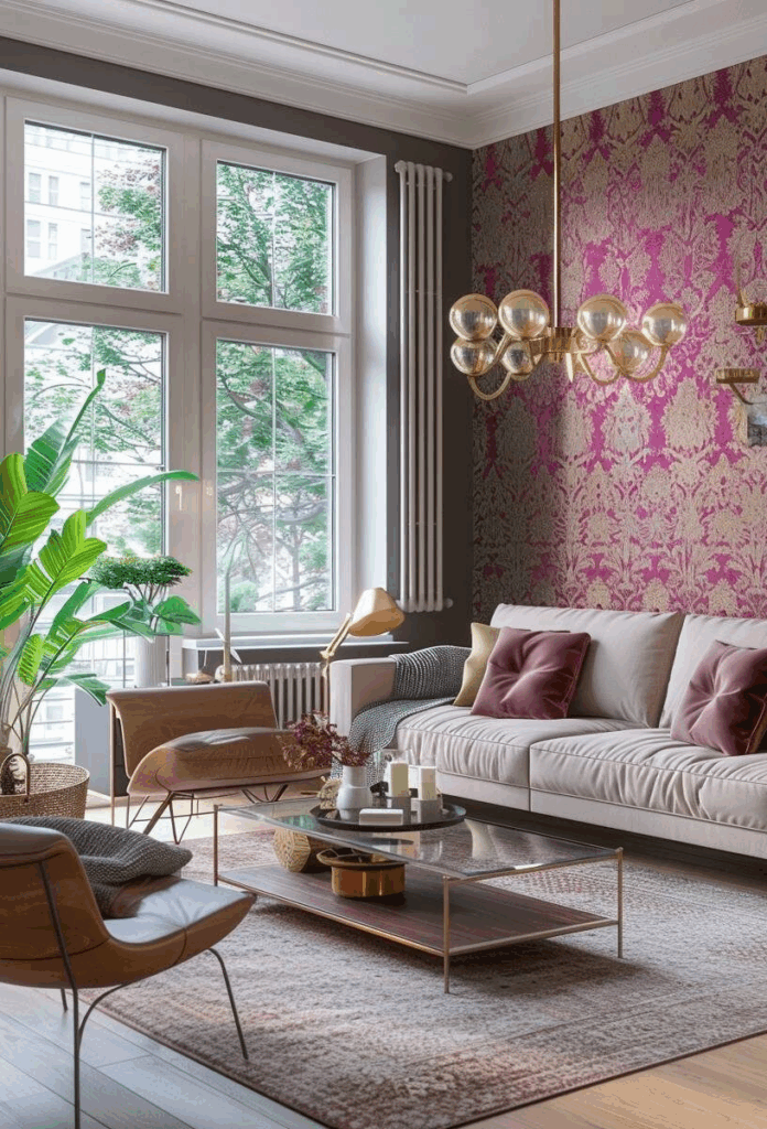 Probiere Tapeten mit fuchsiafarbenen Mustern an einer einzelnen Wand. Geometrische Formen, florale Prints oder Retro-Designs setzen starke Akzente im Wohnzimmer oder Flur. Kombiniere sie mit ruhigen Wandfarben wie Grau oder Beige. So wirkt der Raum modern, aber nicht überladen.