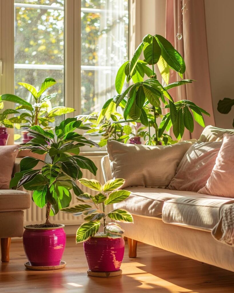 Setze Pflanzen in fuchsiafarbene Übertöpfe, um starke Farbakzente zu schaffen. Grüne Blätter bilden einen klaren Kontrast zur intensiven Farbe. Kleine Sukkulenten, Zimmerpalmen oder Monstera passen gut dazu. Stelle sie auf helle Fensterbänke oder weiße Regale, damit die Farbe wirkt. Kombiniere sie mit neutralen Möbeln, damit nichts ablenkt.