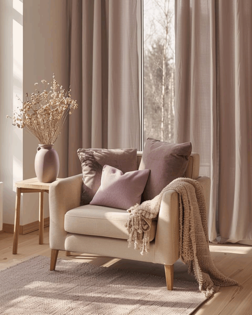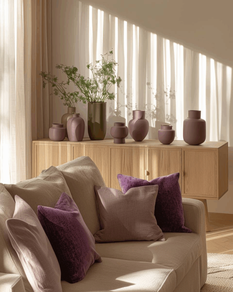 Mach kahle Ecken lebendig mit mauvefarbenen Accessoires wie Kissen, Vasen oder Lampen. Eine kleine Kommode in Mauve bringt Struktur und Farbe. Trockenblumen in Rosé oder Grau passen perfekt dazu. Lichtquellen wie eine Tischleuchte schaffen zusätzlich Wärme. So wirkt jede Ecke sofort gemütlich und durchdacht.