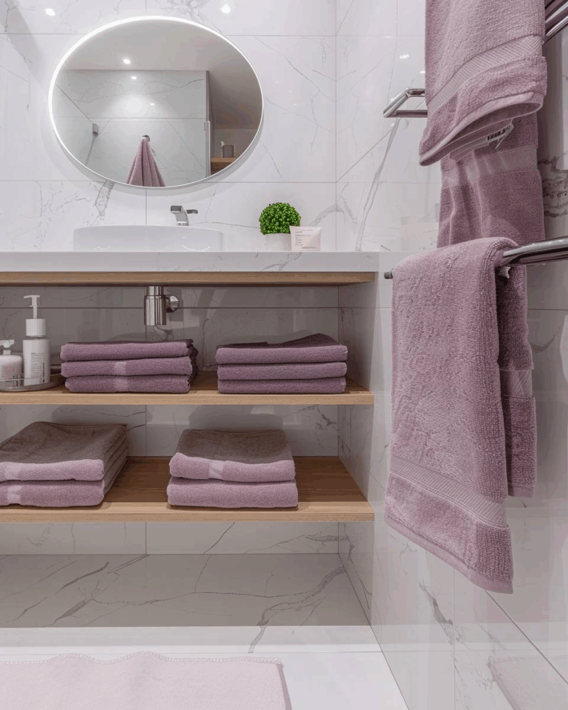 Bring frische Farbe ins Bad mit mauvefarbenen Handtüchern. Sie setzen dezente Akzente und schaffen sofort eine ruhige Stimmung. Besonders gut passen sie zu weißen Fliesen, Holzdekor oder grauen Badmöbeln. Wähle dicke Baumwollhandtücher, damit sie weich und hochwertig wirken. Staple sie gerollt oder lege sie gefaltet in offene Regale.