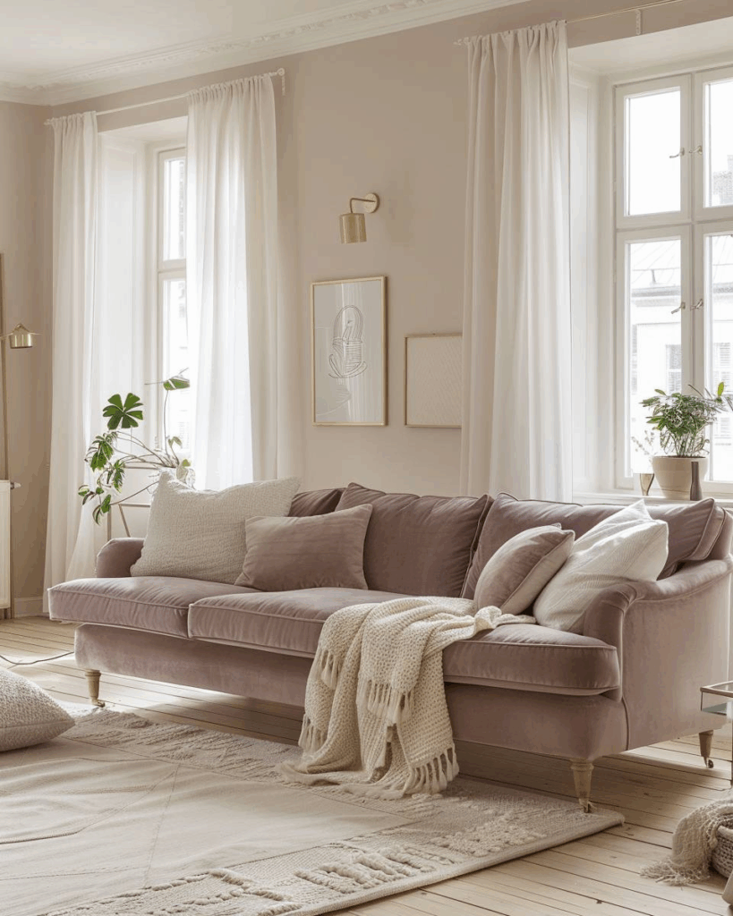 Bring dein Sofa mit mauvefarbenen Plaids auf ein neues Level. Der sanfte Ton passt zu grauen, beigen oder cremefarbenen Sofas und schafft sofort Wärme. Wähle kuschelige Materialien wie Wolle oder Baumwolle, damit es nicht nur gut aussieht, sondern auch bequem ist. Kombiniere dazu einfarbige Kissen in Nude-Tönen, um den Look ruhig zu halten. Falt die Plaids locker über die Armlehne oder Rückenlehne – das wirkt entspannt und wohnlich.