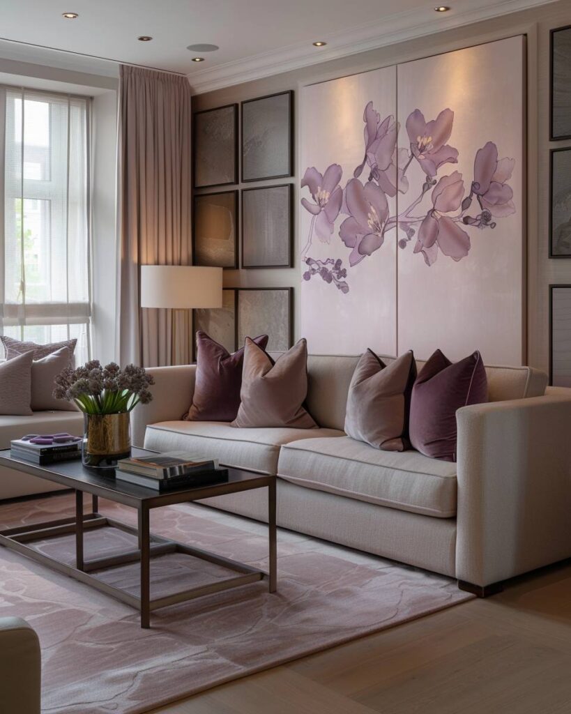 Ein sanfter Wandakzent in Mauve, Kissen in Mauvetönen als Kontrast und Vorhänge aus mauvefarbener Seide sind starke Ideen, die sofort Wirkung zeigen.