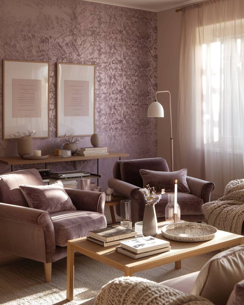 Probiere Tapeten mit Mauveprints an einer einzelnen Wand aus. Muster wie florale Designs oder geometrische Formen bringen Struktur und Tiefe in den Raum. Helle Mauvetöne lassen kleine Zimmer größer wirken, dunkle Nuancen schaffen Gemütlichkeit. Achte auf passende Möbel in Grau, Holz oder Weiß, damit das Muster wirkt. Setze dezente Deko ein, um den Look nicht zu überladen.