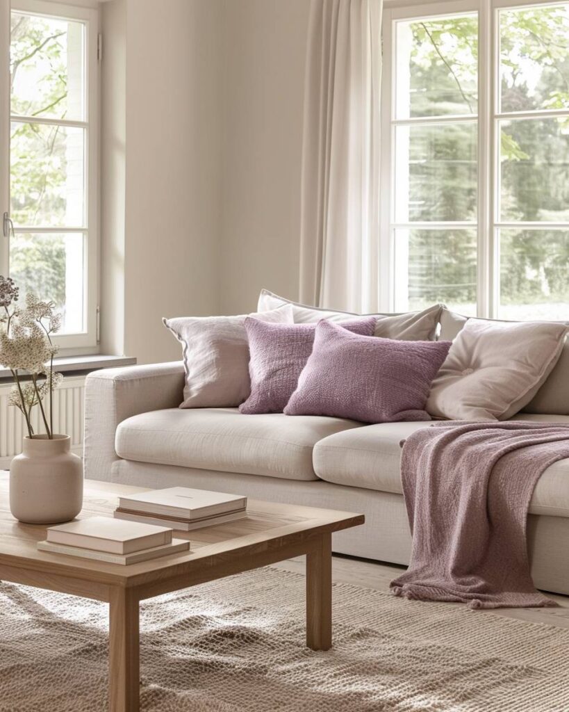 Wähle Kissen in Mauve, um ruhige Räume schnell lebendiger zu machen. Auf einem grauen Sofa oder einem beigen Sessel setzen sie starke Farbkontraste. Kombiniere sie mit groben Stoffen wie Leinen oder Wolle, damit sie nicht zu verspielt wirken. Besonders gut passt ein kräftiges Mauve zu warmen Holztönen oder kühlen Betonflächen.