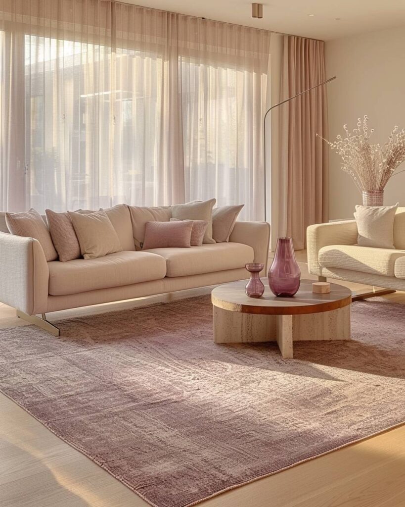 Setze auf sanfte Ruhe mit Mauve und Cremetönen. Mauve bringt eine kühle Eleganz, Cremetöne gleichen das mit Wärme aus. Zusammen wirken sie ausgeglichen und weich, besonders auf Wänden, Textilien oder Teppichen. Kombiniere matte Oberflächen mit natürlichen Stoffen wie Leinen oder Baumwolle. So entsteht ein stimmiges Gesamtbild, das den Raum beruhigt.
