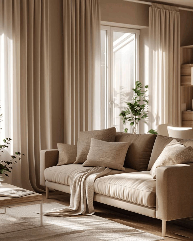 Setz auf taupefarbene Vorhänge, wenn du dein Zuhause ruhig und stimmig gestalten willst. Taupe passt zu hellen Wänden, Holzböden und neutralen Möbeln. Der Stoff wirkt weich und nimmt grelles Licht. So entsteht ein harmonisches Gesamtbild, das nicht langweilt. Kombinier dazu Textilien in Beige, Grau oder Creme.
