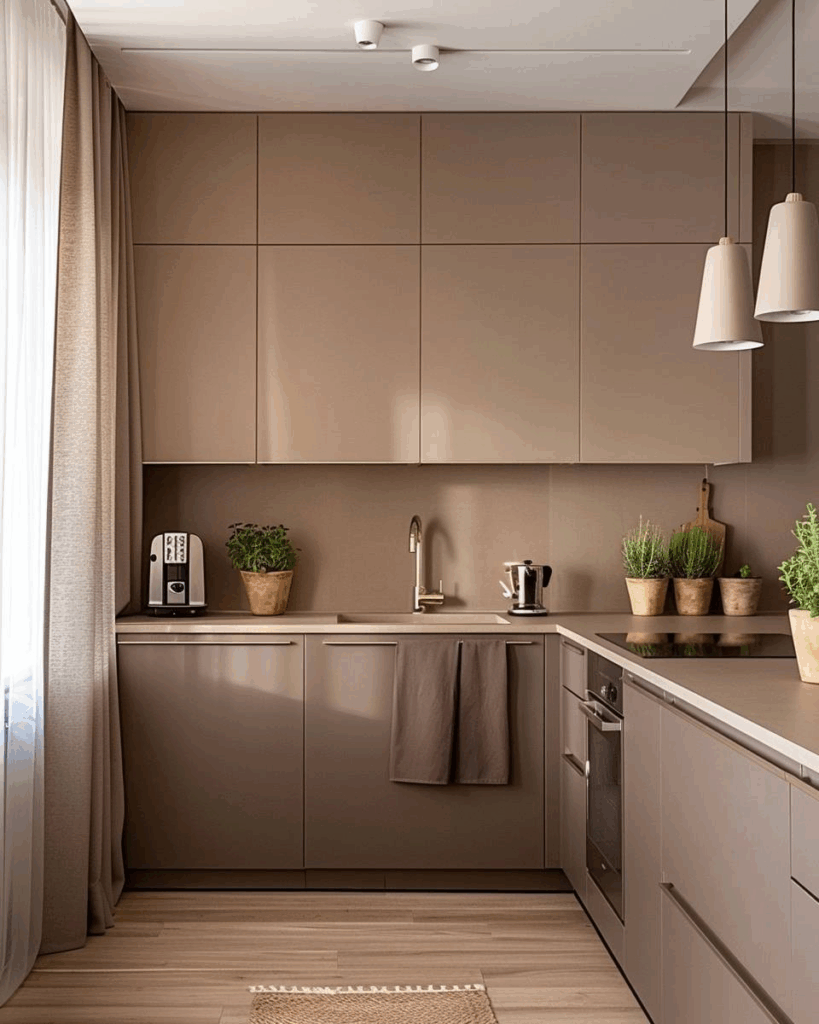 Bring Taupe in deine Küche mit Fronten, Wandfarbe oder Rückwand ins Spiel. Taupe ist ruhig, warm und passt zu Holz, Schwarz oder Weiß. Kombiniere matte Schränke in Taupe mit naturbelassener Arbeitsplatte. Setze kleine Akzente mit Textilien, Deko oder Griffen in Taupe. So wirkt deine Küche modern, ohne kühl zu sein.