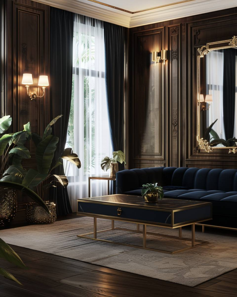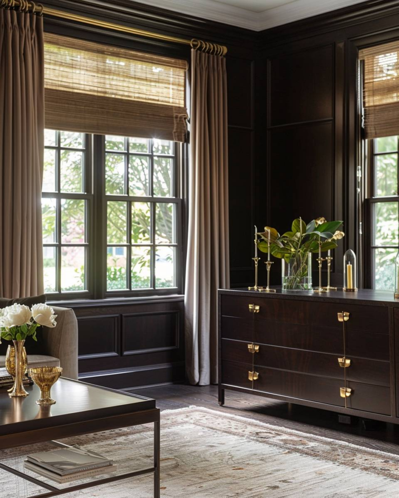 Kombiniere dunkles Holz mit goldenen Akzenten