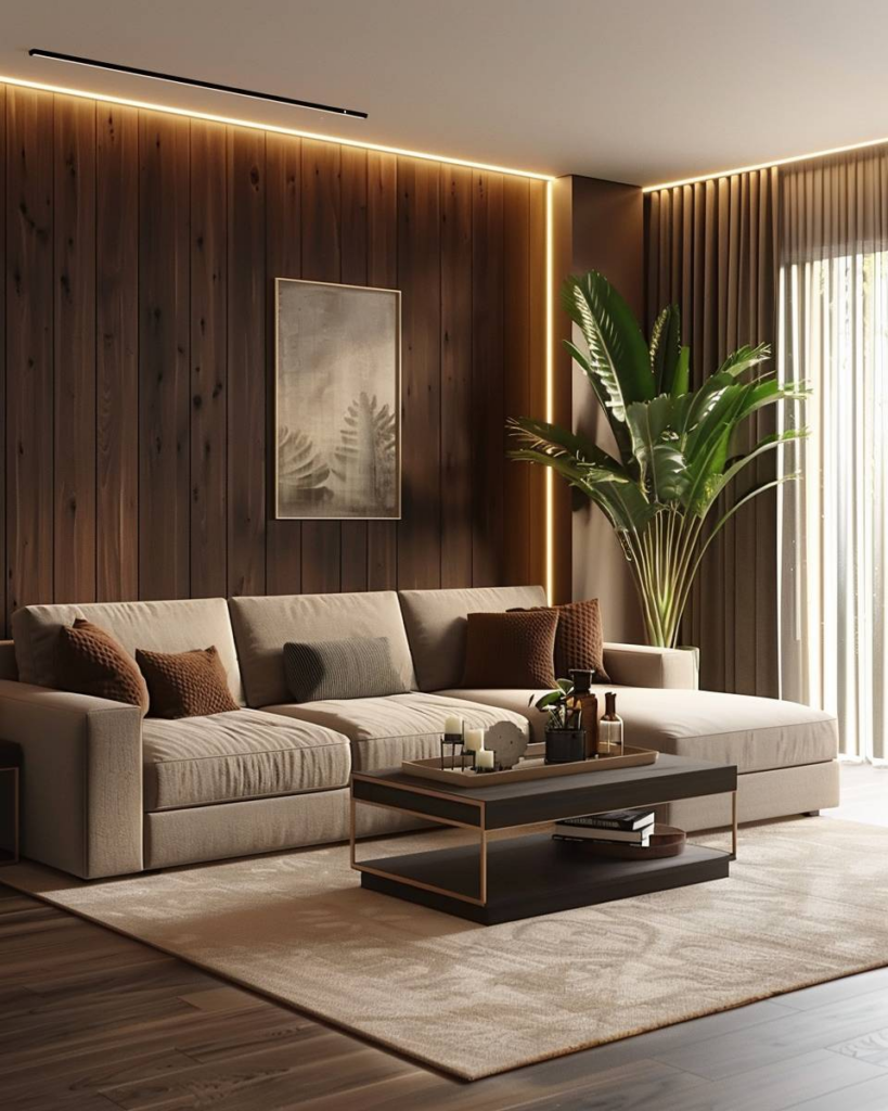 Dunkle Holzpaneele an der Wand bringen Wärme und Tiefe in dein Zimmer. Wir kombinieren sie mit hellen Möbeln, damit der Raum offen bleibt. Eine gezielte Beleuchtung hebt die Maserung hervor und schafft Atmosphäre. Du kannst mit grünen Pflanzen den Look natürlich ergänzen.