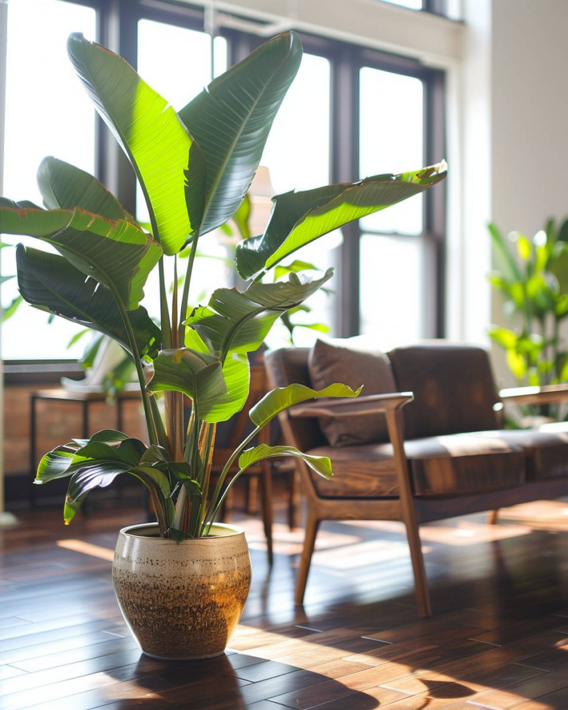 Platziere große Pflanzen auf dunklen Holzböden