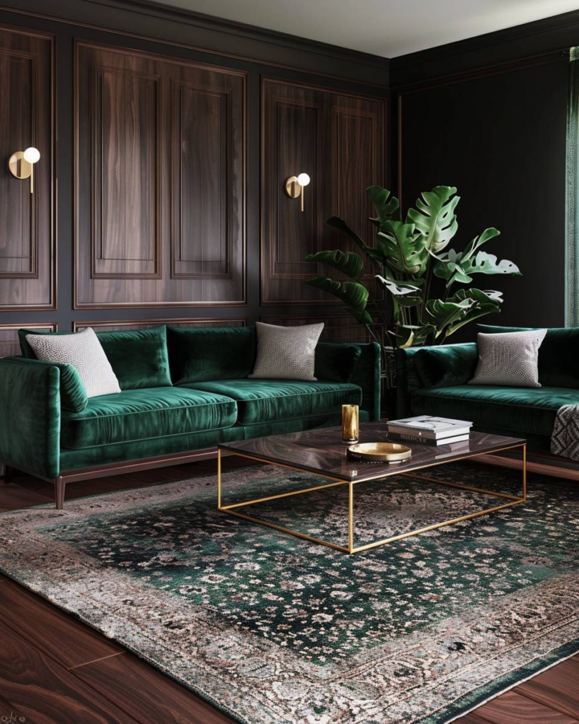 Setze auf Samtsofas, um wärmere Kontraste zu dunklem Holz zu schaffen. Samt fühlt sich weich an und bringt einen lebendigen Farbtupfer ins Zimmer. Warme Töne wie Rost, Senf oder Dunkelgrün geben dunklen Holzmöbeln mehr Tiefe. Du schaffst so eine gemütliche und moderne Atmosphäre.