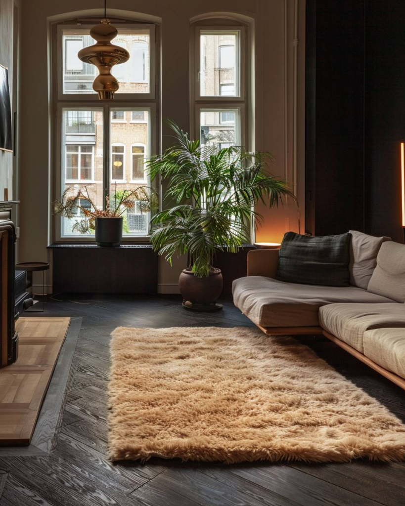 Setz auf Wollteppiche, um dunkles Holz einladender zu machen. Die weiche Struktur schafft Wärme und dämpft Schritte. Du bringst damit Gemütlichkeit und Farbe in den Raum, ohne das schöne Holz zu verdecken.