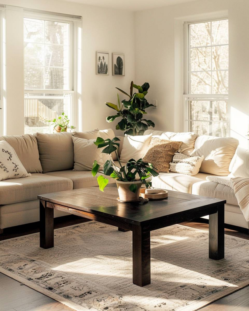 Dunkle Massivholz-Tische bringen Ruhe ins Wohnzimmer. Du setzt mit solchen Couchtischen ein warmes Statement. Nutze klare Formen, damit das starke Holz wirkt. Helle Accessoires wie Vasen oder Schalen aus Glas bilden dazu einen frischen Kontrast. Halte die übrige Deko schlicht, dann zieht der Tisch alle Blicke auf sich.