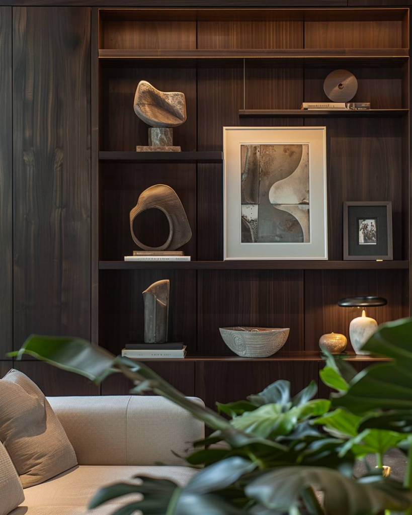 Stelle Kunstobjekte auf dunklem Holz aus, um starke Kontraste zu schaffen. Helle Skulpturen oder Bilder wirken direkt vor einer dunklen Holzoberfläche lebendig. Mattes Holz sorgt für ein ruhiges Ambiente, glänzende Flächen ziehen den Blick auf sich. Setze gezielt Licht ein, damit Formen und Farben klar sichtbar sind.