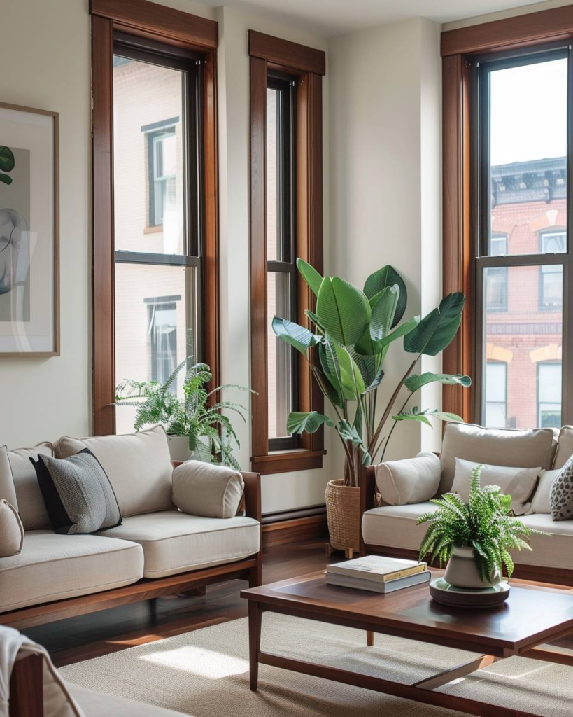 Setze Fensterrahmen aus Walnussholz in Szene, um dem Raum Tiefe zu geben. Das dunkle Holz bringt einen edlen Kontrast zu weißen Wänden. Wir setzen gezielt dezente Vorhänge ein, damit das Holz sichtbar bleibt. Eine klare Fensterbank aus Stein hebt die warme Maserung des Holzes hervor. Pflege den Rahmen regelmäßig mit Holzöl, damit er lange schön bleibt.