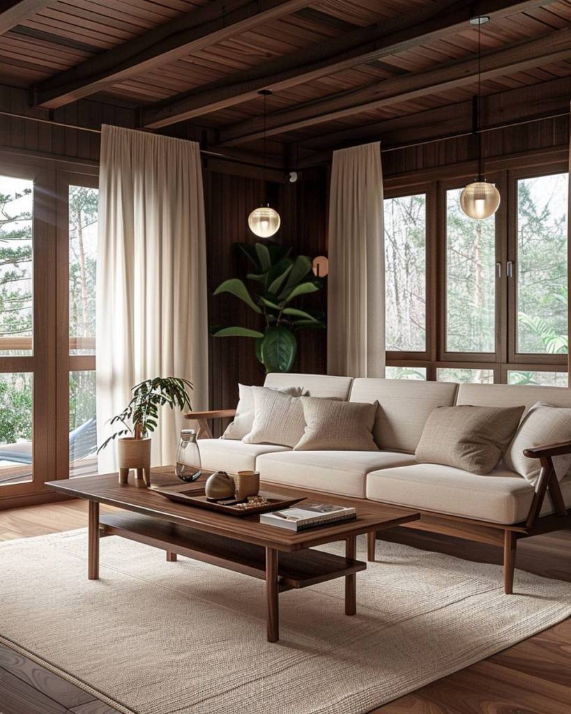 Setze auf offene Balkendecken aus dunklem Holz. Sichtbare Deckenbalken schaffen sofort Charakter und Wärme. Kombiniere sie mit neutralen Farben und klaren Linien. Zusammen bringen dunkle Balken und schlichtes Mobiliar Ruhe in den Raum. Halte den Stil reduziert, damit die Balken wirken.