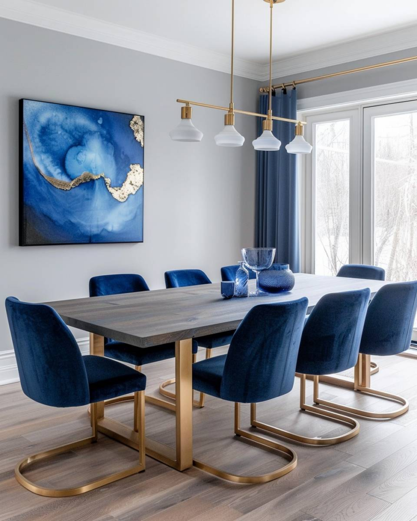 Wähle blaue Samtstühle als Hingucker für dein Esszimmer. Der tiefe Blauton bringt Ruhe in den Raum. Der weiche Samt wirkt luxuriös. Kombiniere die Stühle mit einem Holztisch. Setze auf goldene Details bei Lampen oder Deko für ein modernes Bild.