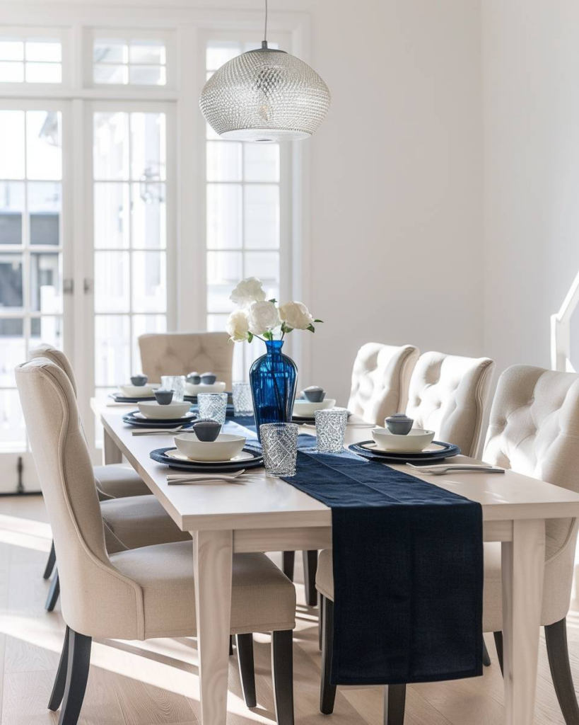 Bringe marineblaue Tischläufer auf deinen Tisch, um sofort einen Rahmen für dunkle Holzmöbel oder weiße Geschirrsets zu setzen. So lenkst du den Blick auf Blautöne und schaffst Kontraste zu silbernem oder goldfarbenem Besteck. Du gibst dem Raum ein ruhiges, modernes Aussehen und lässt den gesamten Essbereich klar und ordentlich wirken.