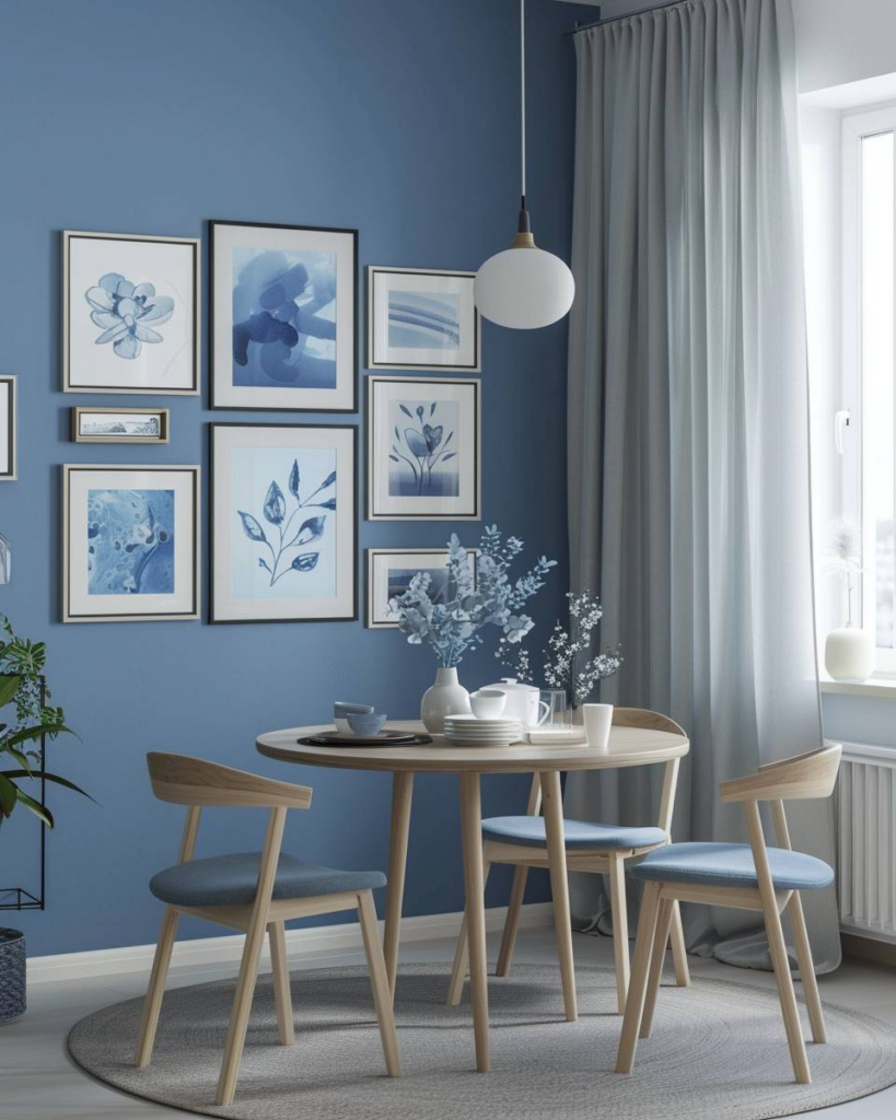 Gestalte eine Bilderwand in Blauschattierungen