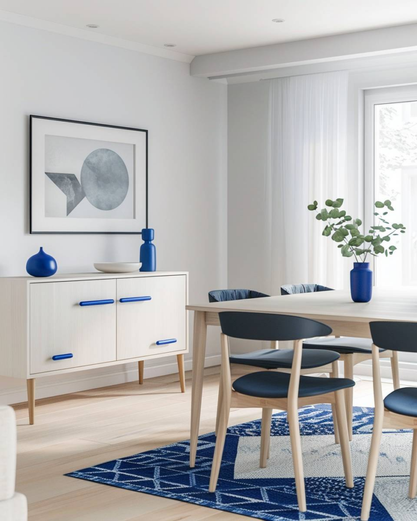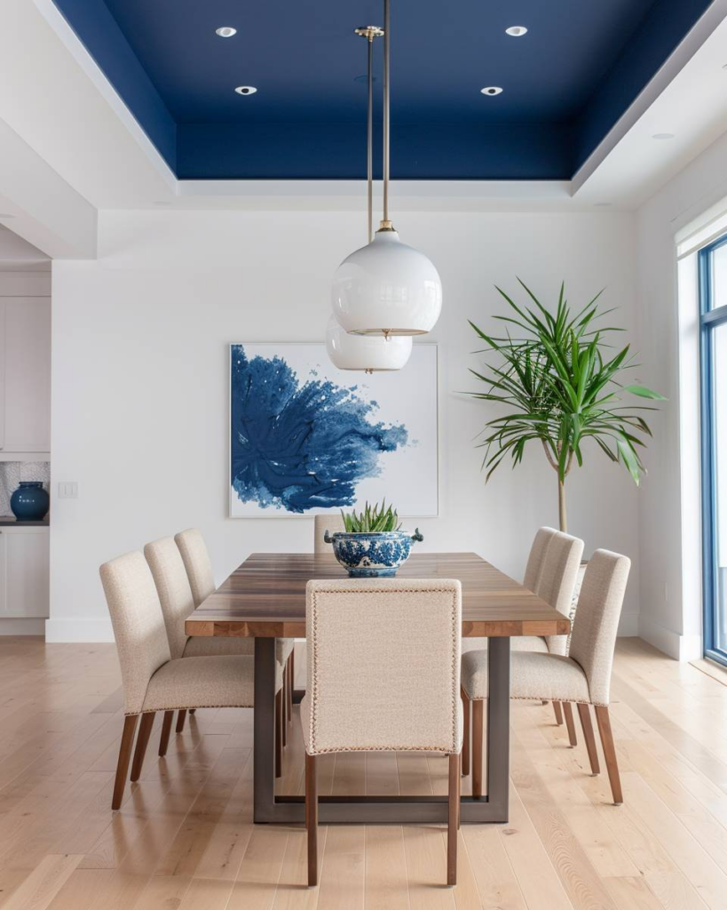 Blaue Gemälde bringen Ruhe und Frische ins Esszimmer. Wir wählen klare, abstrakte oder maritime Motive. Passe Bilderrahmen und Aufhängung an den Raumstil an. Hänge die Kunstwerke so auf, dass sie beim Essen ins Auge fallen. So nutzt du Kunst gezielt als Blickfang.