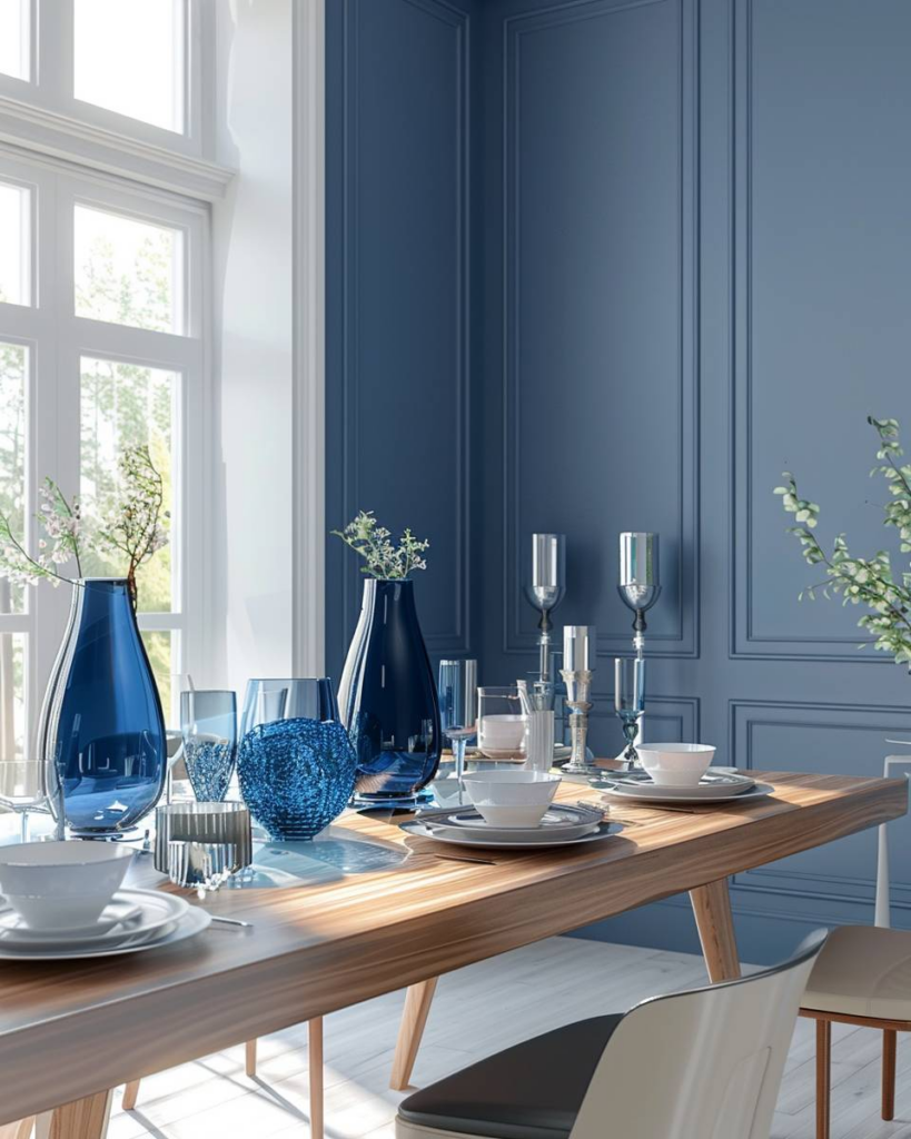 Wechsle alte Deko mit blauer Glasdeko aus. Blaue Glasvasen, Kerzenhalter und Schalen setzen einen klaren Akzent. Glas spiegelt das Licht im Raum und lässt dein Esszimmer direkt frischer wirken. Mit wenigen Handgriffen schaffst du einen ruhigen und modernen Look.