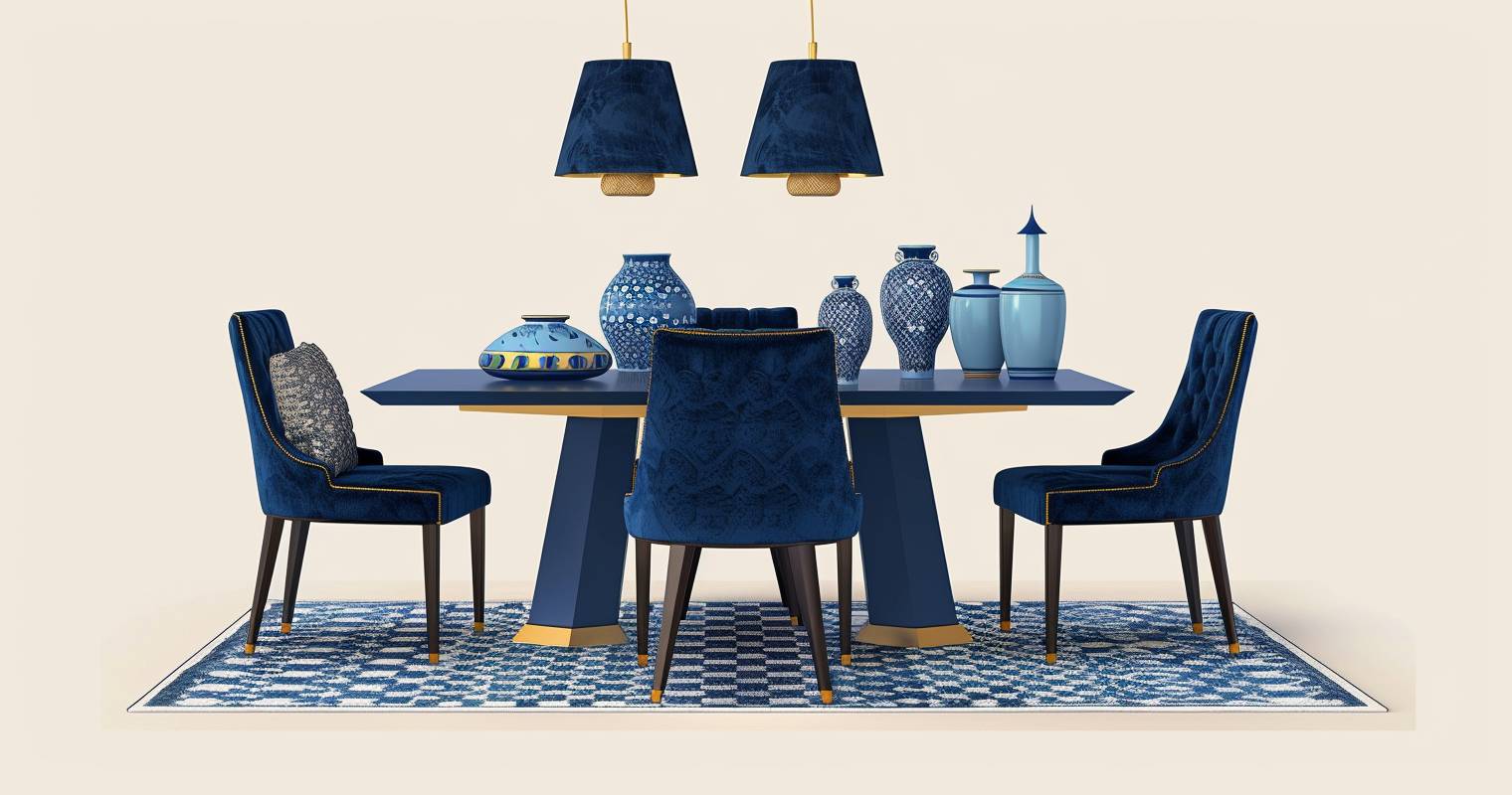 Wenn du dein Esszimmer gestalten und einrichten willst, bringen verschiedene Blautöne, elegante Samtstühle und dekorative Keramik schnell neue Ideen und Inspiration in deinen Raum.