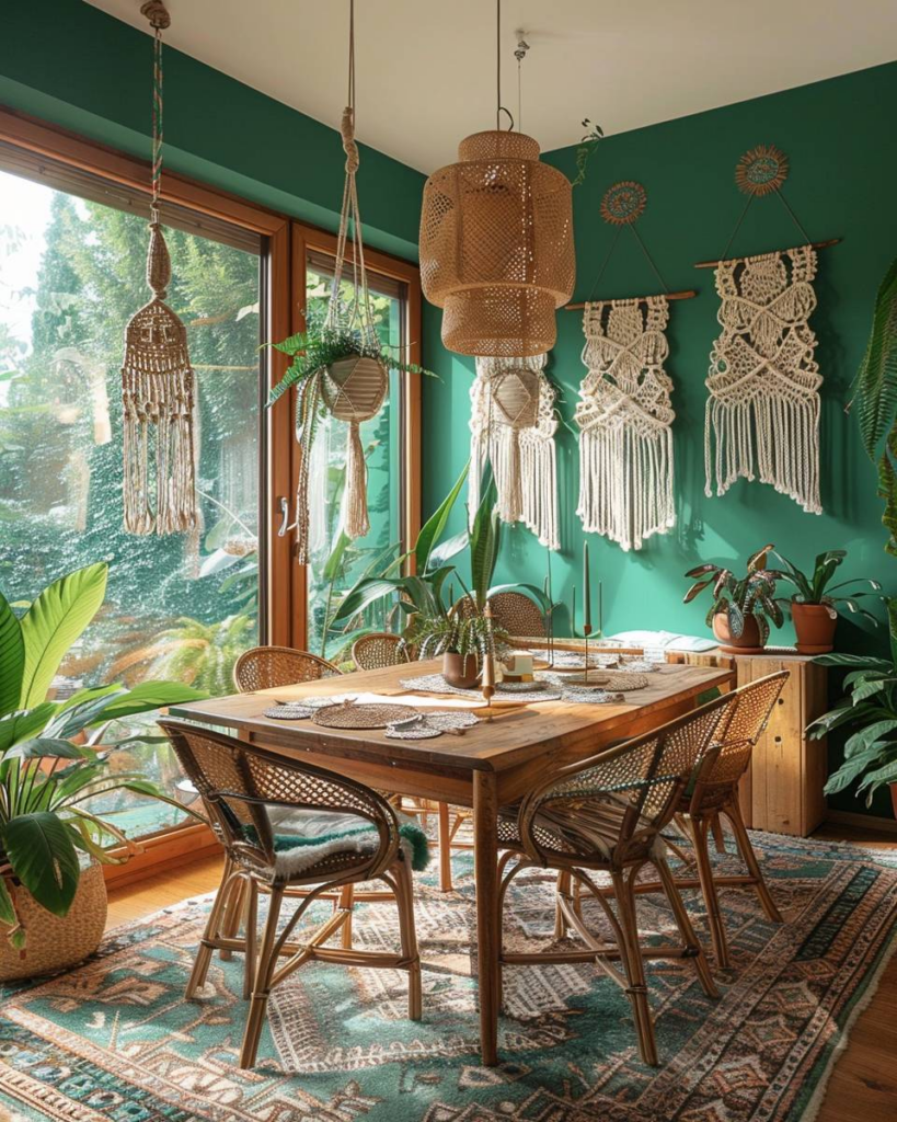 Bringe Makramees an deiner Wand oder über dem Esstisch an. Naturfasern wie Baumwolle sind perfekt, weil sie zu grünen Wänden und Holz-Möbeln passen. Kombiniere mehrere Makramees in unterschiedlichen Größen, um dem Raum mehr Struktur zu geben. Nutze sanfte Grüntöne im Makramee-Garn, damit alles harmonisch bleibt. So entsteht sofort Boho-Charme und du schaffst eine gemütliche Stimmung.